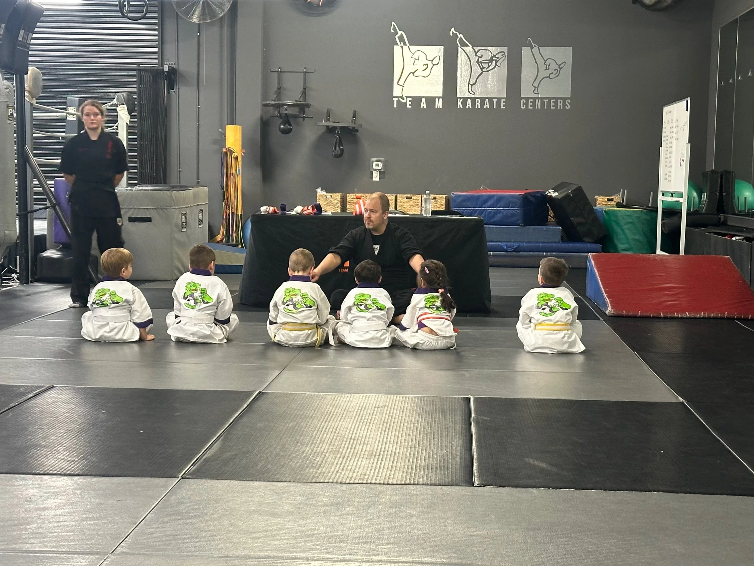 Though karate may be known for its kicking and punching, we don’t allow any physical conflict between students at this young age. Hitting anyone, inside or outside of class, is not tolerated. We work to provide tools for conflict deescalation with others.